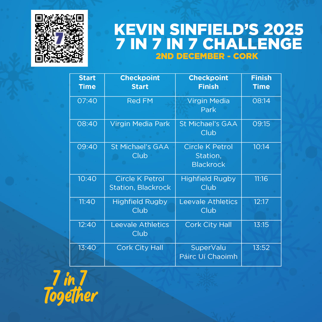 Commenting on the latest challenge Sinfield said, “Our visits across the Irish Sea have always been one of the highlights of challenges in the last two years. It was so special to be joined by Charlie Bird in Dublin in 2023 and we had tremendous support in Belfast last year, especially meeting the family of former Antrim GAA footballer Anto Finnegan. We have some special connections to the city in our team. We can’t wait to get to Cork on 2nd December.”