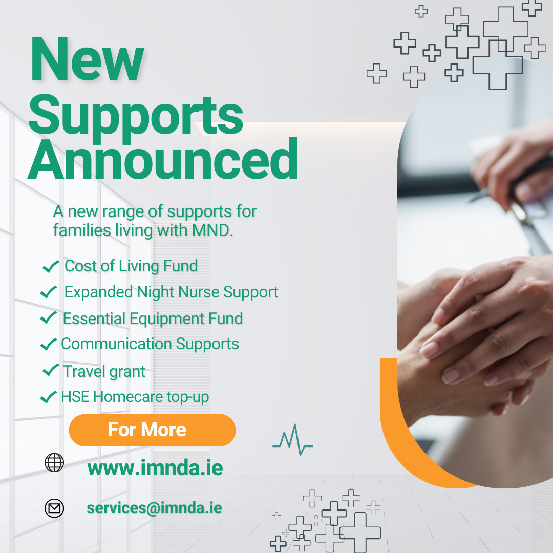At our annual conference in Cork this October, the IMNDA team was delighted to share news of a new range of supports for families living with MND. We are now pleased to say these supports are fully up and running and available to you through consultation with your MND nurse.